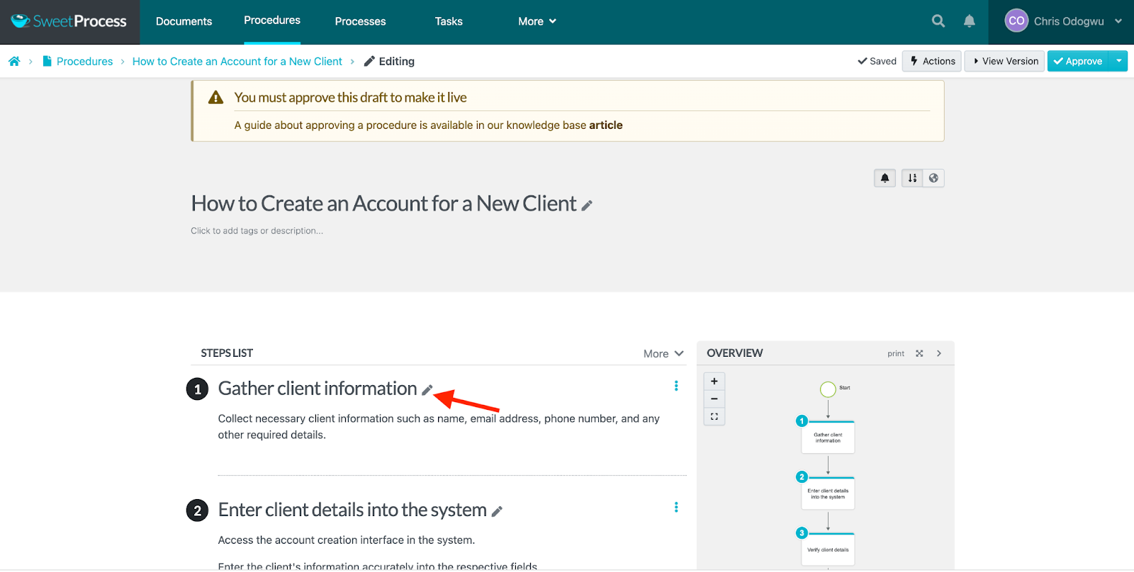 You’ll see all the steps you added to the process on the right. Click on “Approve” to publish it.