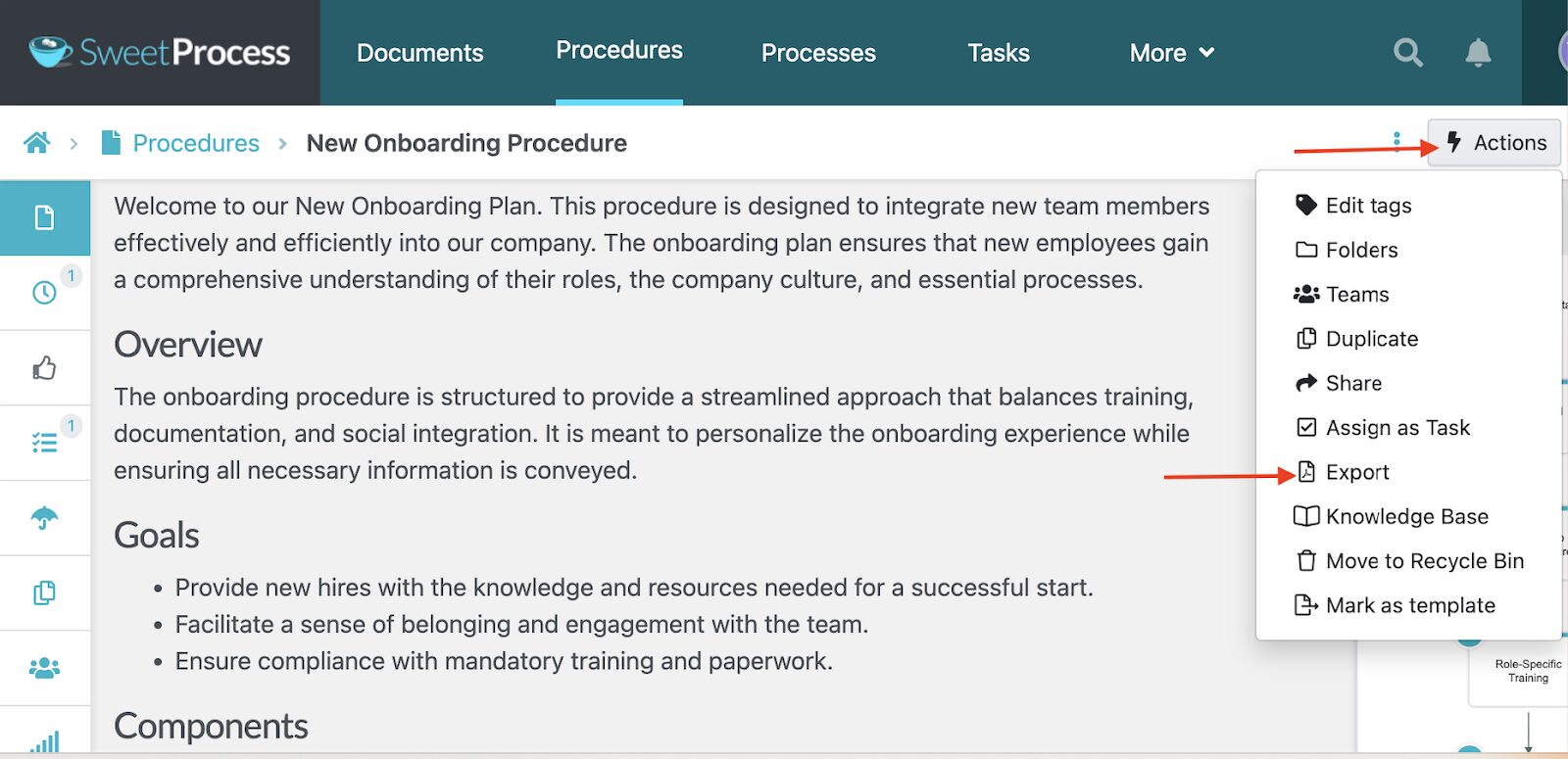 With SweetProcess, you can export your procedures in multiple formats, including Word documents, PDF, and HTML.