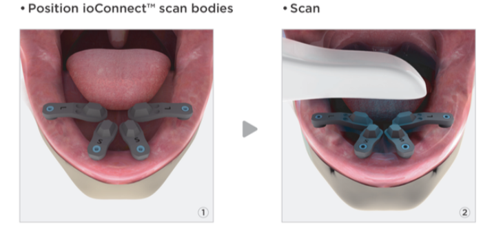 - Take full scan records for fabrication of a prototype that fits the actual implants using the TruAbutment ioConnect and Dual Align Scan Body Workflow