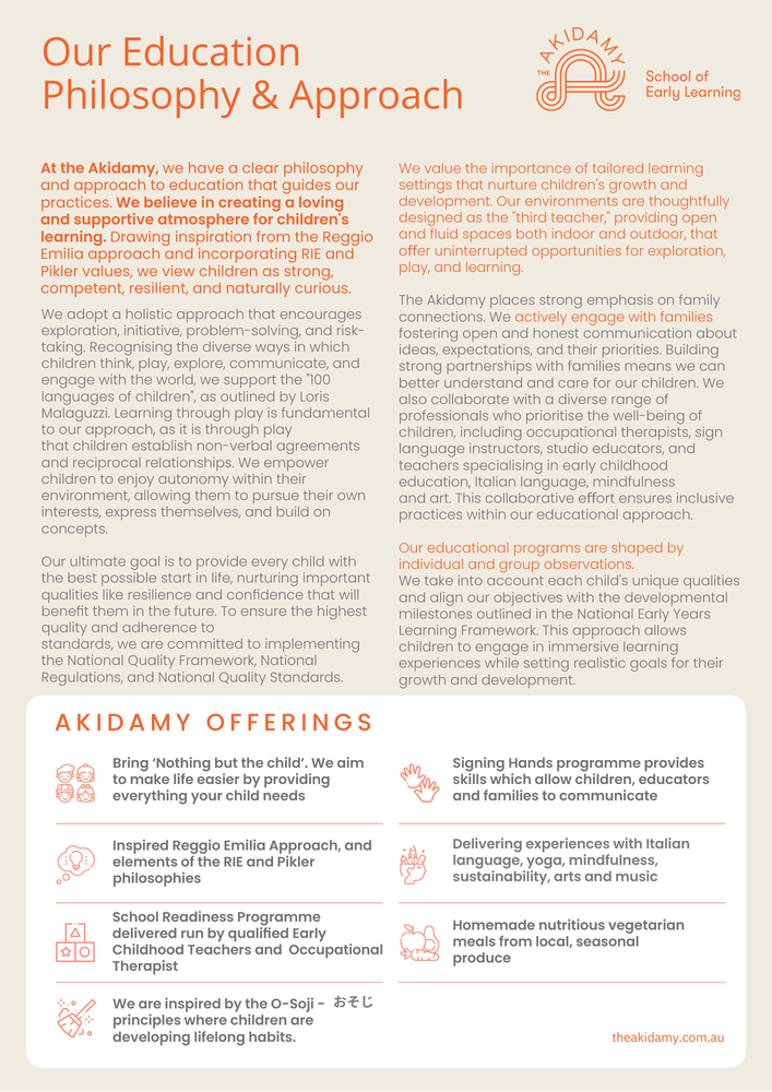 The Akidamy is inspired by the Reggio Emilia approach with RIE and Pikler values. Through Reggio Emilia, we consider the child as strong, competent, resilient, and full of curiosity and wisdom. Through '100 languages of children,' we recognise that children have many ways of thinking, playing, exploring, communicating, and doing. When learning through play, a child is using their non-verbal agreement to a reciprocal relationship. We encourage them to enjoy and be autonomous within the environment around them. We encourage children to seek their own interests, express themselves and build/return to provocations. We aim to provide every child with the greatest start in life and cultivate characteristics such as resilience and confidence that will help them in the future.Reggio Emilia Philosophy & Approach