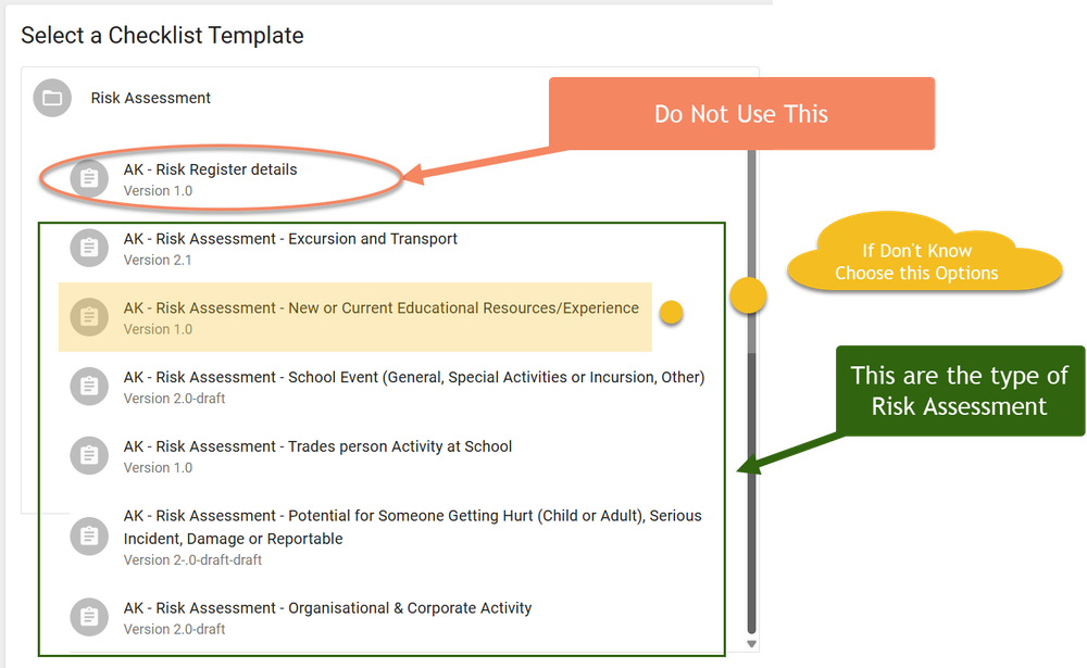 Using the School Checklist Selection (Example: Perth or Fremantle School) - Studios Selection is Not Advised.You wil pick the location of the Activity with in the Risk Assessment Form.