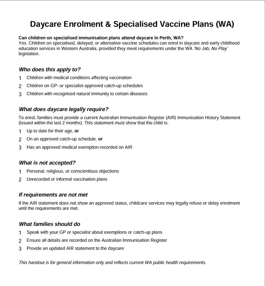 Currently there are different immunisation requirements for early childhood education and care services across states and territories. Information on immunisation requirements are listed below.| WESTERN AUSTRALIA (WA) |