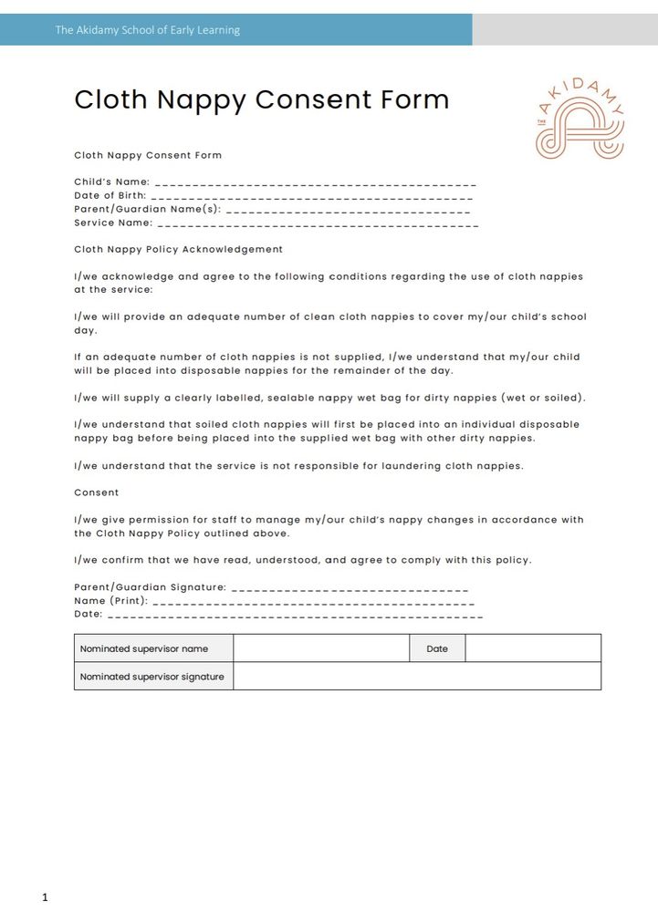 - If using Cloth Nappies a separate consent form will be required to be signed before your child's commencement.