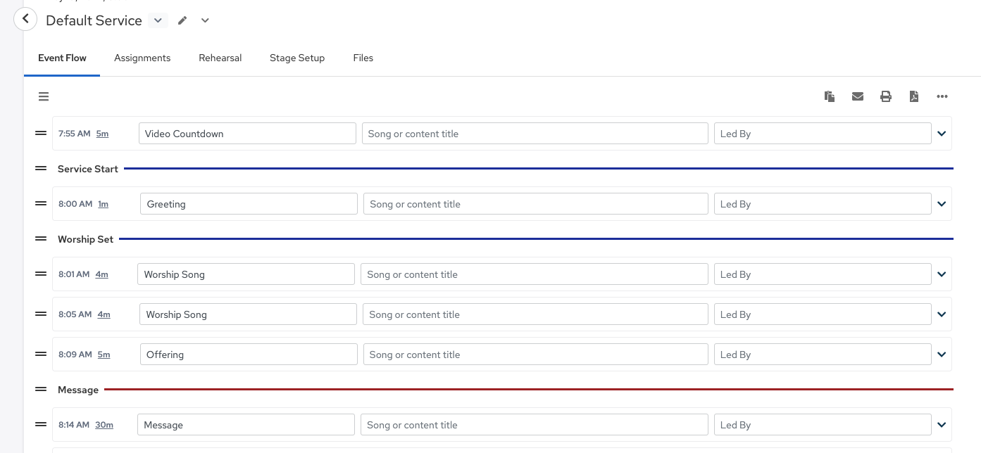 Divider text and colors will appear any place the worship flow is displayed, including printouts, and publicly shared worship flows (for Helpers to see).