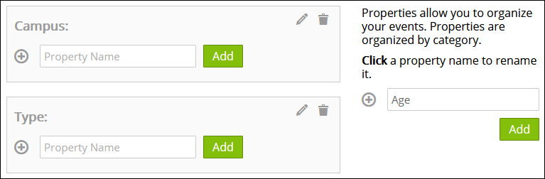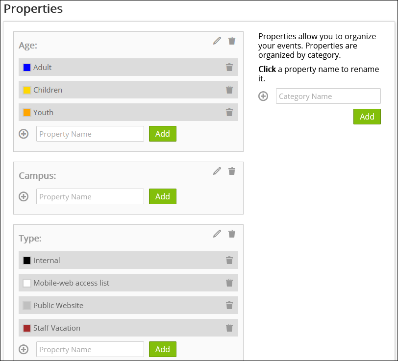 When setting up an event or other ministry activity, you can assign unique properties to each. Properties allow you to easily organize and filter events by criteria and even colors for easy recognition. (Think of Properties as ways to 'tag' your events).