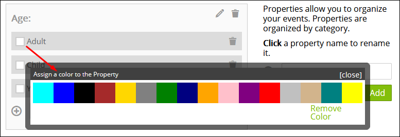 - Property → To edit the color of the Property, click on the small square box to the left of the property name and select a desired color.