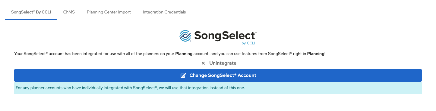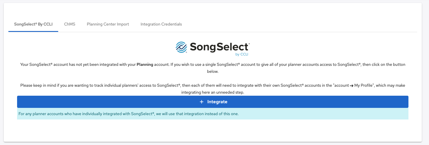 The advantage to integrating at the church level is that it's more convenient for you and your worship editors to set up. The drawback is that you may not want all planners of "worship editor" security level to have access to the SongSelect resources, or you may want to track with greater granularity how each of your worship editors are using SongSelect. If each worship editor is integrated individually with their own SongSelect login, resource utilization information is accessible from within the SongSelect site.
