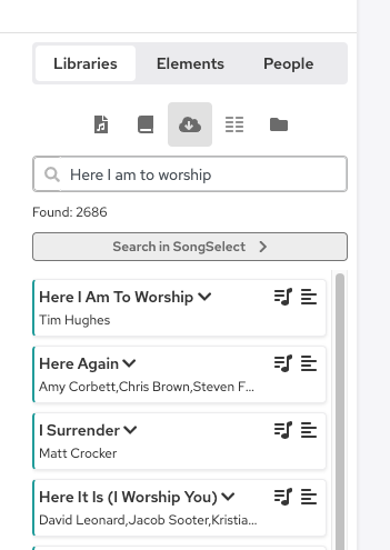 To use the integration in your Event Flows, you will navigate to the Event Flow page for any service and then click into the right panel. It defaults to the "Libraries" tab and from there you will see a cloud ion with an arrow. Once you click on that you can begin typing in a song name and then click "Search in SongSelect" and it will bring up a number of song options to use in your Event Flow.