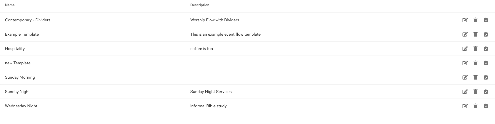 Event Flow Templates can be used to create services with all the generic event flow elements in place that are recurring from week to week. When you create an event, you'll be able to select one of these templates from which to create, or you can apply one directly to a service.