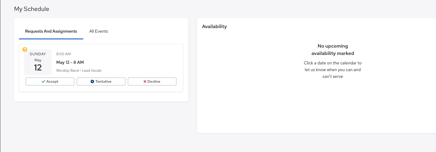 If you have marked yourself as Tentative, you will still need to let your Leader know via response whether or not you can serve once you are certain that you can/can not fulfill your assignment request. You may also change your response on an assignment from here as well.