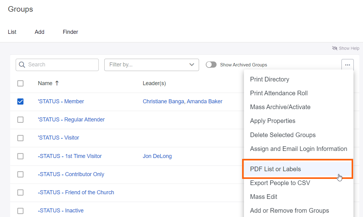 1. Click the Groups tab and check the box next to the Group(s) for which you'd like to print mailing labels.