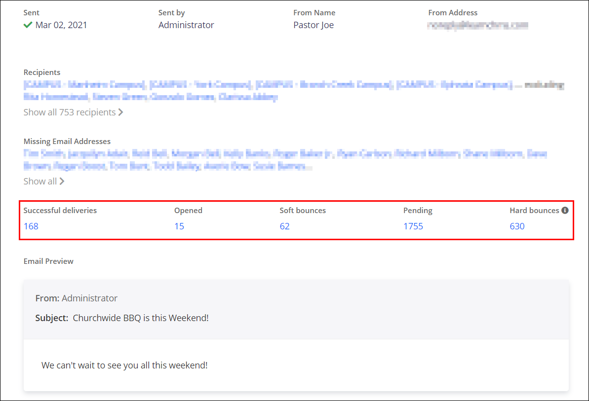 Email Statistics gives you the ability to track, understand and troubleshoot the important emails that your ministry sends out. Being able to see how many people have opened your email will help you see where your communication is working. Similarly, the ability to see what emails did not make it to their destination will help you to continue to improve your data.