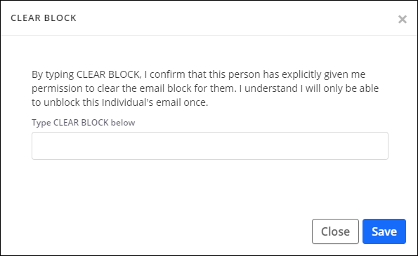 A new screen will appear asking you to confirm the Clear Block action, follow the instructions and you will have unblocked your user for mass communication. Please note that this action can only be performed once!