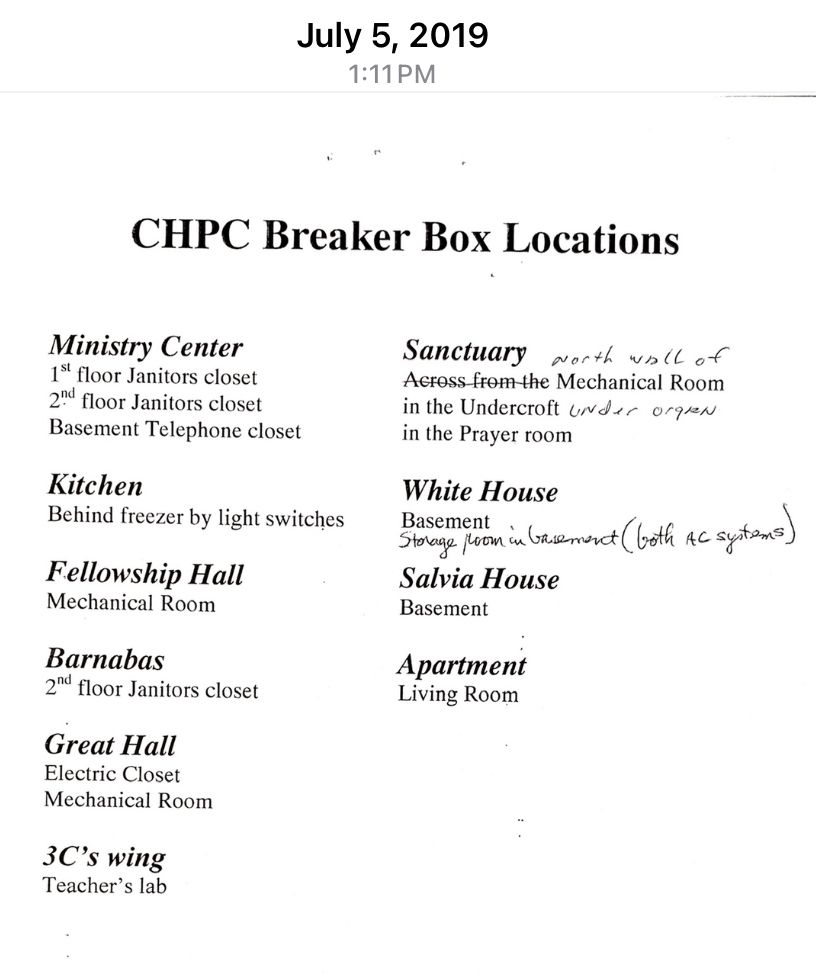 3Sanctuary Undercroft Electrical RoomEnter the east undercroft door, across from the boiler room door. Watch Your Head!! Sit on a rolling seat and carefully walk yourself straight into the electrical area. The large breaker box LP? is most often the one to look at.