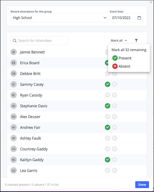 - (Planned soon) Groups with over 100 people will be automatically switched to the Optional Absences. If necessary, you can still use “Mark All” to record absences for every group member that didn’t attend.