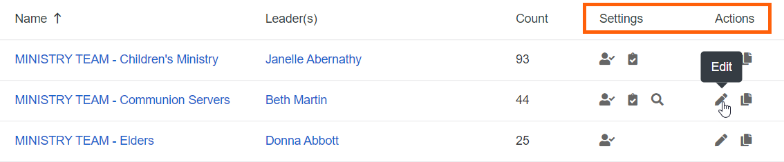 On the Groups screen, Settings and Actions Columns columns include helpful icons with tooltips so you can quickly identify which features are enabled for a Group.