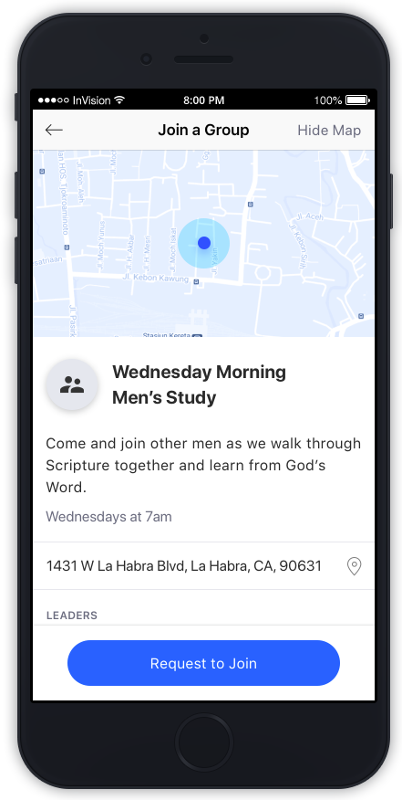 - Allow people to request to join the group: When enabled, an individual can request to join using a similarly titled button *(screenshot from our integrated Mobile App below). As soon as they do, an approval email will be sent to the group's leader before that person can be added to the roster. If the group does not have a group leader, the request notification will be sent to the Administrators instead.