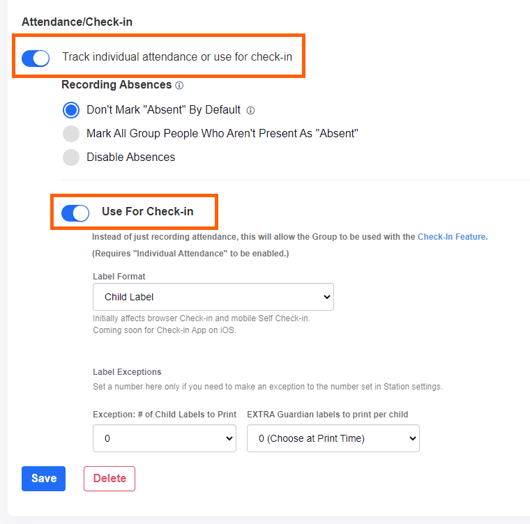 Selecting the Use for Check-In button will allow people to use Check-In via web browser, iPad App, our integrated Mobile App, and more. Check-In simplifies and automates your attendance process, as well as includes the ability to print labels, name tags, and security receipts. Get a great start and Learn More about check-in here!