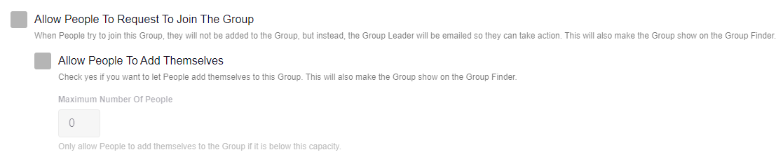 - Allow people to add themselves: When enabled, individuals will immediately be added to the Group. If you select this option, you can set a limit for the number of people that can be in the group. If you leave it blank, there will be no limit.