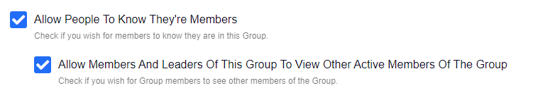 - Allow People to Know They're Members allows individuals within a group to see ONLY the Group Name.