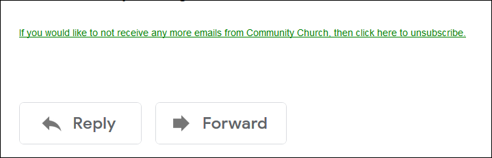 When a contact email is sent, the recipient will receive the email with this message at the bottom “If you would like to not receive any more emails from [Insert Your Church Name], then click here to unsubscribe.”