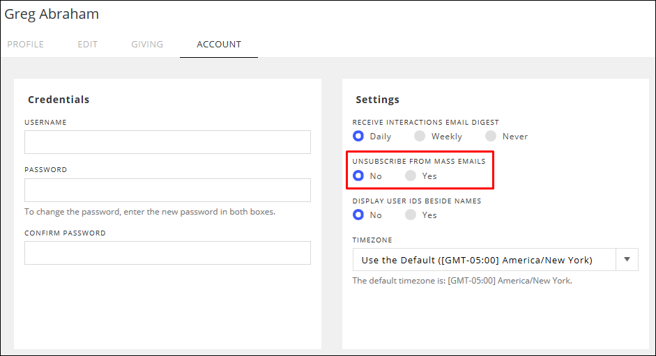 A member can also unsubscribe through their profile in the database. This will opt the user out of ALL Email communications sent to them. The user (or Admin) can find this under the profile for the member under the Account tab → Settings → Unsubscribe From Mass Emails.