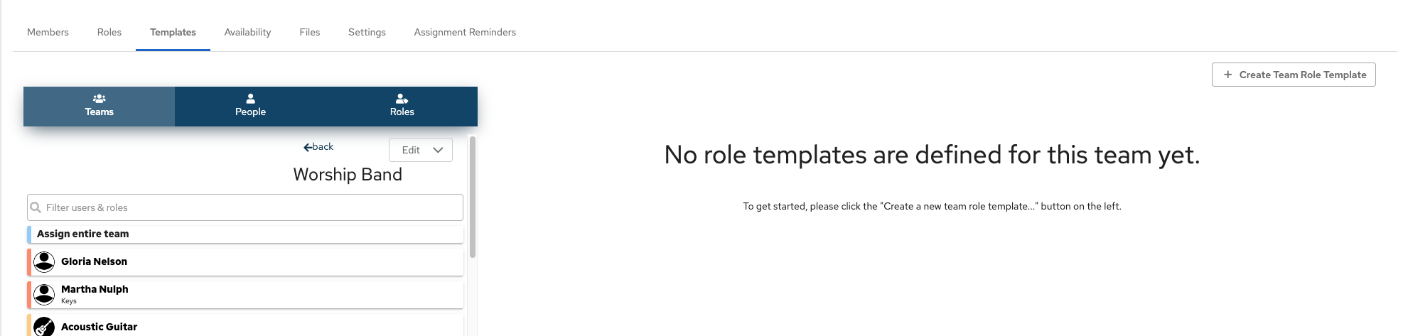 Team templates are useful for creating a group of standard roles that are used week after week for a team. You can even add a specific person to a team template in situations where that person serves in that role on a regular basis. Team Templates are set up on the team management pages. From the People Teams tab, you can access those pages by clicking on the team name Templates.
