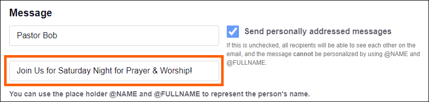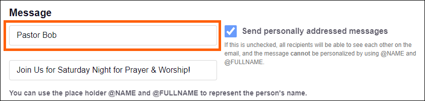 Use @NAME or @FULLNAME to dynamically insert an individual's member's First Name or First/Last name, respectively. If a Preferred Name is in the member's profile (Ex, Robert & Bob), the Preferred Name will be used (Ex, Bob). Other placeholders from the software are not supported at this time.