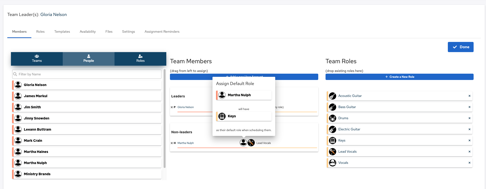 Now you'll need to make sure each person has the right skills defined. To do so, simply drag and drop from the "Team Roles" section to the "Team Member" you are wanting to assign the role to. Once you have completed assigning roles, click "Done" in the upper right hand corner of the screen.