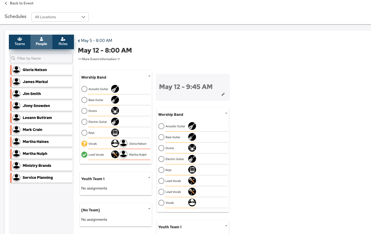 This is the easy part. Just schedule roles for services on your team, to do this you will click into a specific event> go to the "Assignments" tab and then click "Edit Assignments" on the right side of the screen.. Any roles scheduled that don't have anyone assigned, or are "Declined" by someone, will be available for self sign-up. In the image below, every role listed is available for someone to sign themselves up, if they had a matching skill.