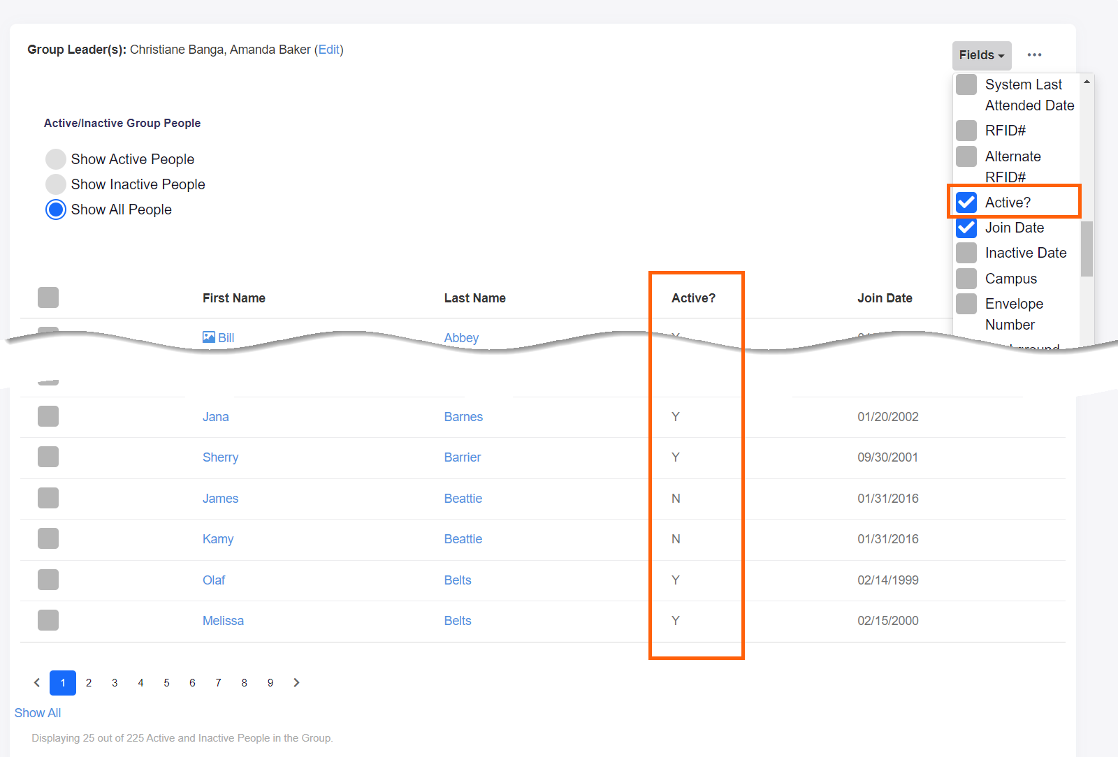 After selecting a group, select the Fields drop-down menu, then select Active? as one of the columns to display. When the Show All People filter is selected, the Active? column will display Y or N for active or inactive individuals.