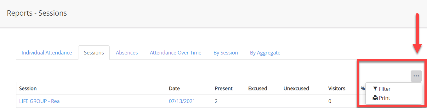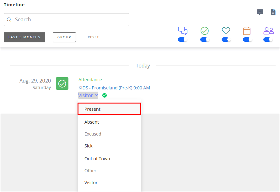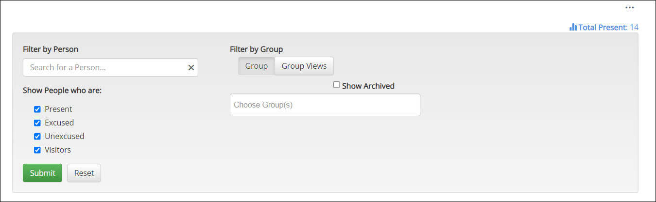 Use the Filter tools to find: a particular member(s), filter based on attendance status, and/or filter based on Group or Group Views.