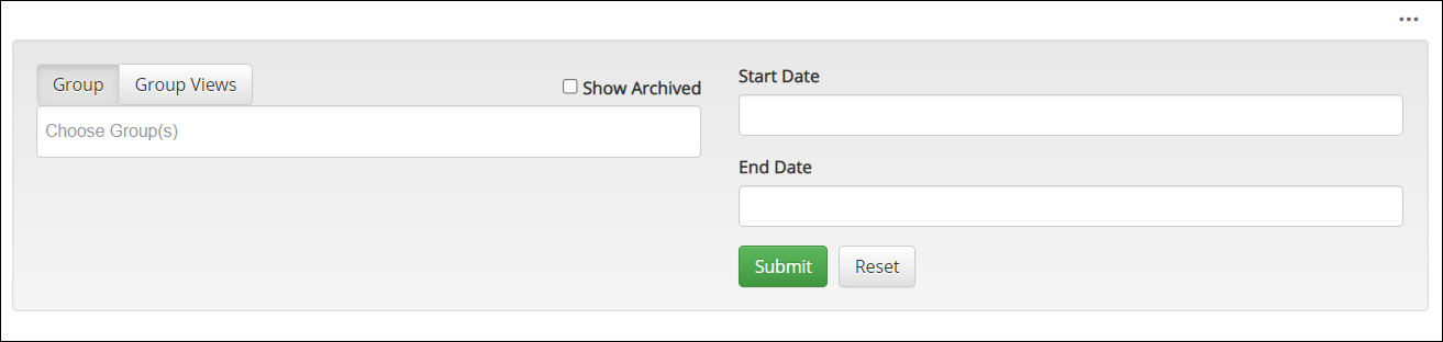 - A modal will appear at the top of the report allowing you to set filters for your Sessions list. Filter based on Group(s), Group Views, Start Date, and End Date.