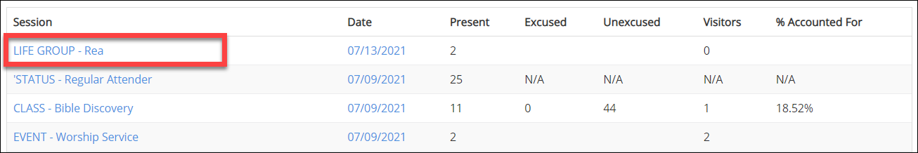 When using the default list, reviewing a filter list, or clicking through pages, there is the option to open each attendance session to view more information. The captured attendance session has a clickable name link which opens the details.