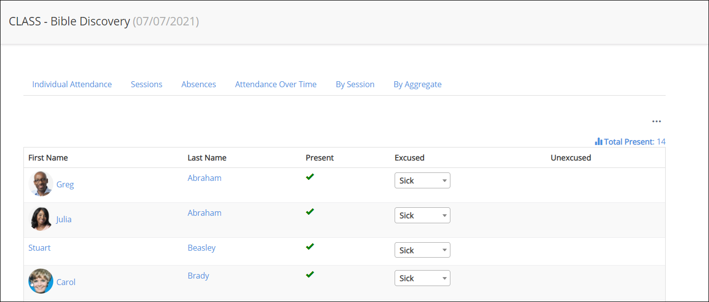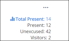 The Total Present link under the 3-Dot Icon displays quick stats with total numbers for Present, Unexcused, and Visitors.
