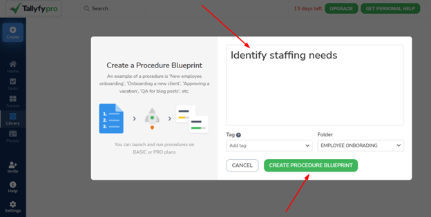 Step 5: Type in the name of the procedure to be added to your blueprint and click on “Create Procedure Blueprint” as shown by the arrows.