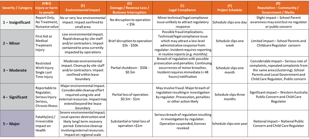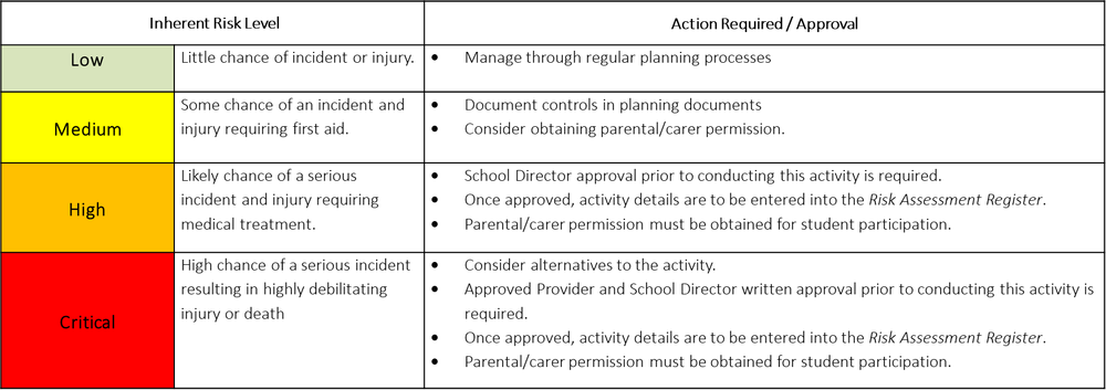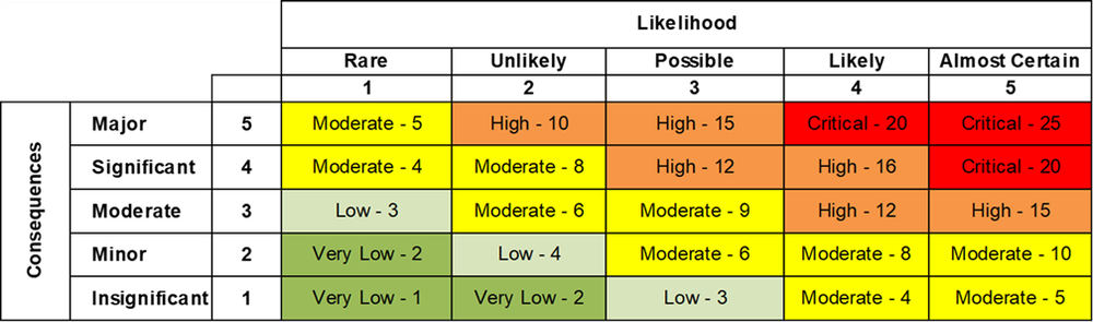 - Risk Assessment (No Controls or Inherent Level) - based on Likelihood and Consequences to assign risk score outcome from the Risk Matrix