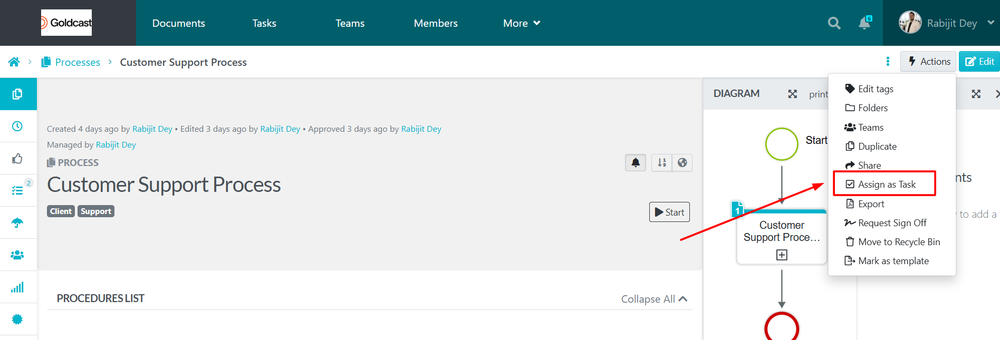 Click on the Process and then click on the "Assign as Task" in the process which you want to assign to your employee as a task.