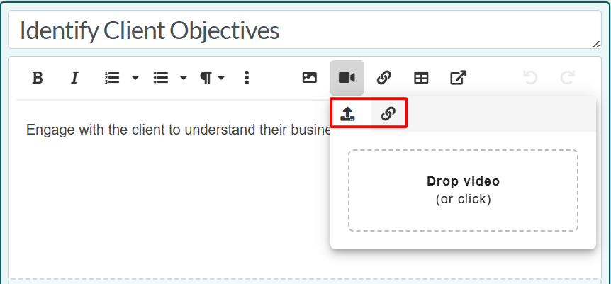 Click the upload icon to upload your video file or drag and drop the video you want to upload, if you want to embed the video through an URL like Youtube / Vimeo then click on the link icon and paste the URL.