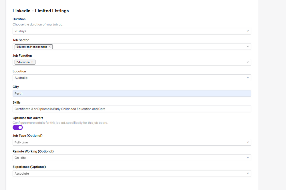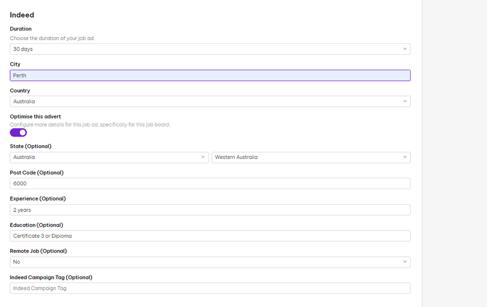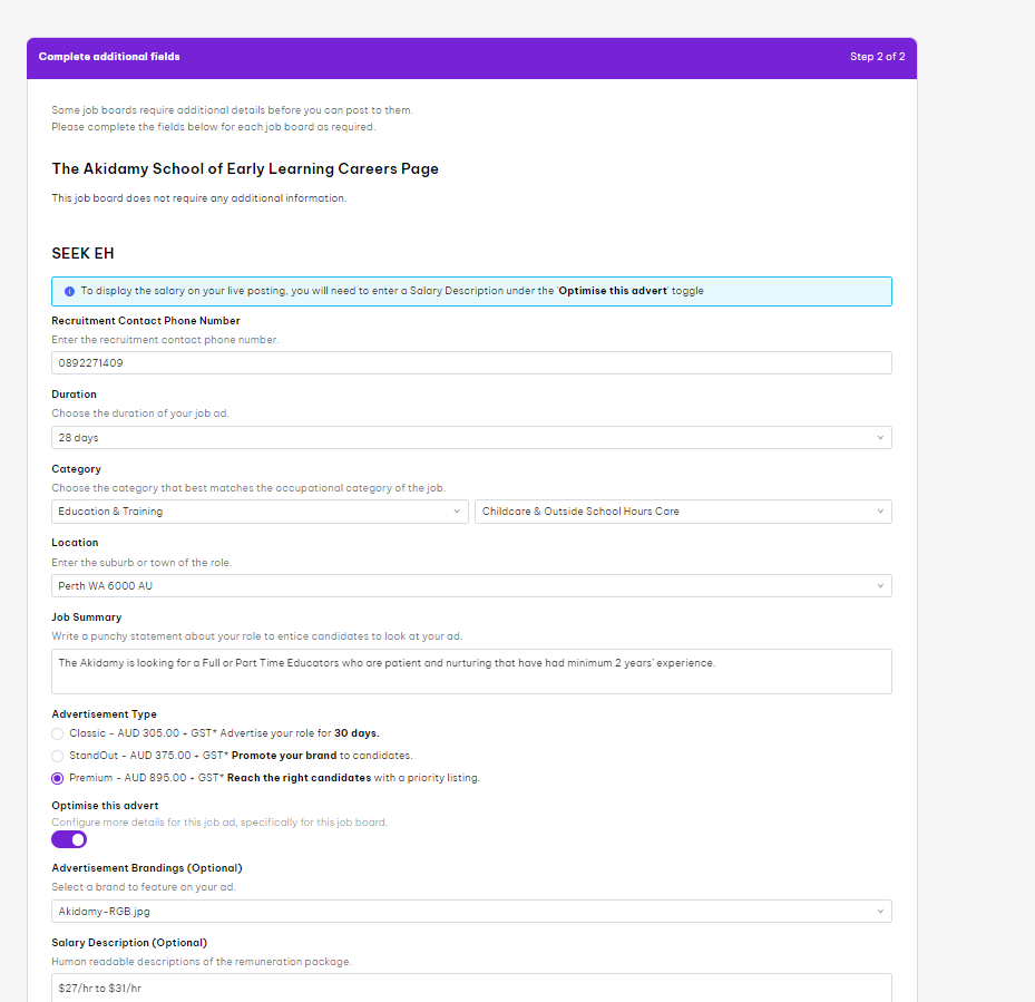 SEEKStarting with SEEK, fill in all the boxes , eg below. Generally we use the "Premium" ad (most expensive), once you select this, go an press ""Optimise this advert" button and fill in the extra details a below.
