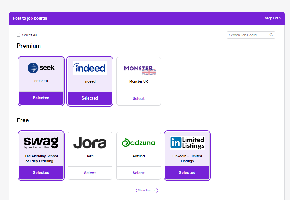 Press "Select" underneath the boards you want to use eg. SEEK, InDeed, Jora, Linkedin, then scroll down and press "Continue""