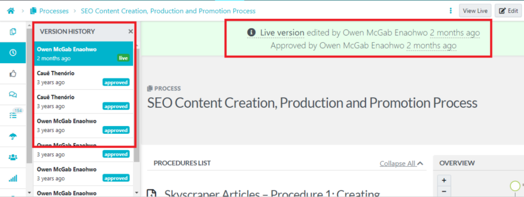 Step One: Identify and click on the process you want to add to the existing procedure. In this example, we will add a procedure that we have already created titled “Content Creation” into a process titled “Content Marketing.”