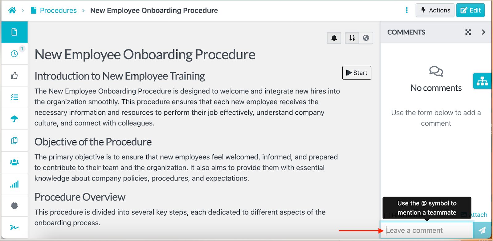 This tab is also ideal for managers when they need to track progress in real time. You can add a comment directly on the procedure to align with the team.