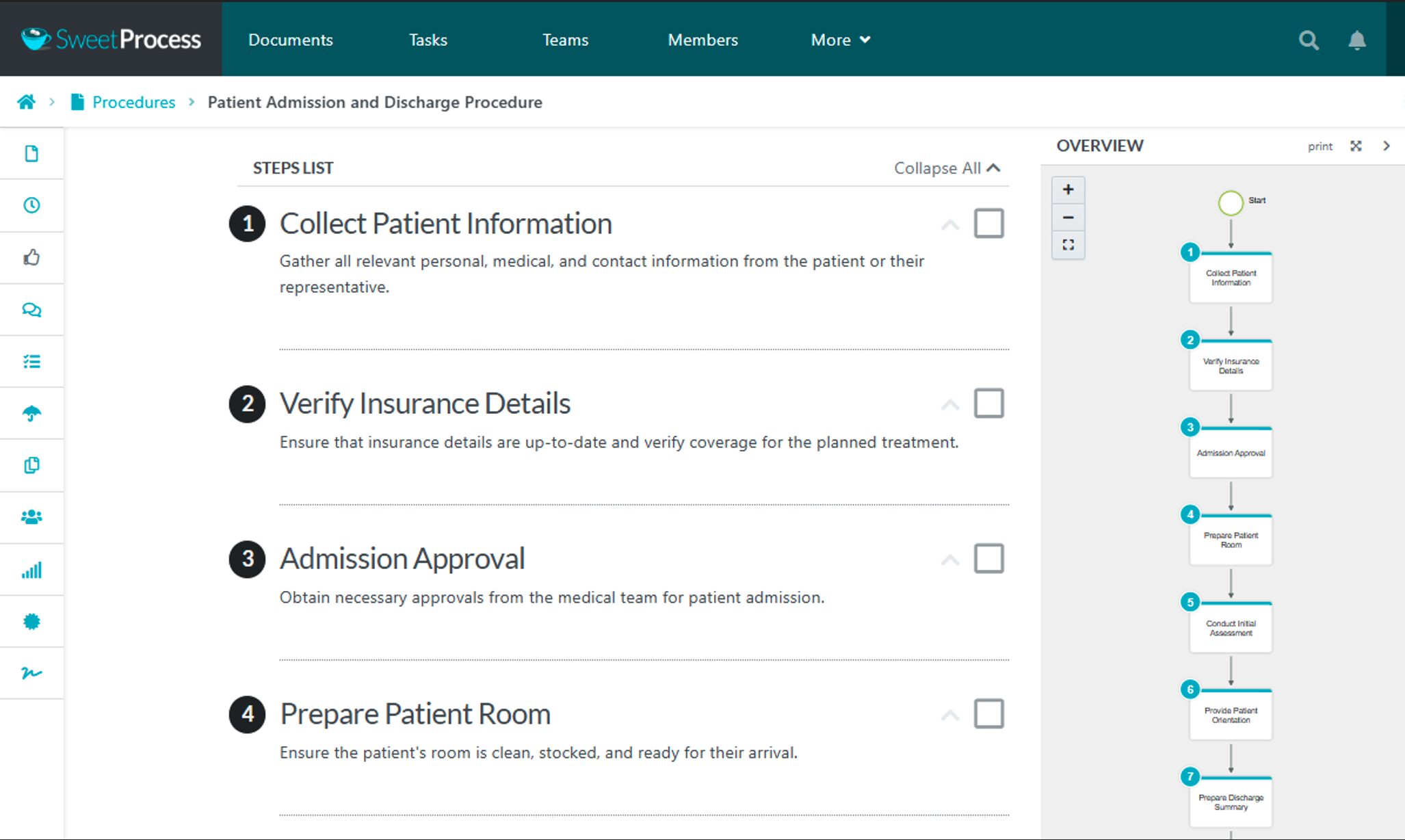 A hospital is a typical setting that can implement a text-based SOP for patient admission and discharge procedures. Standardizing these processes greatly improves patient management by reducing wait time and enhancing faster access to healthcare. This, in turn, increases patient satisfaction while ensuring compliance with regulatory requirements.