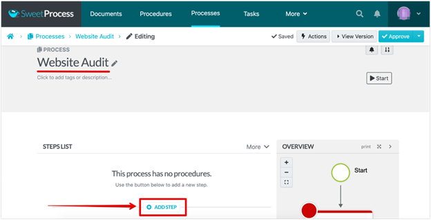 After naming the process, you can create or add existing procedures as steps in the process. To do this, click on “Add Step.”