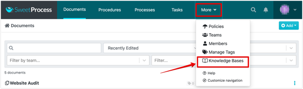 First, click on the “More” dropdown menu from your SweetProcess dashboard. Then click on “Knowledge Bases,” as shown below.