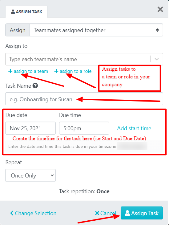 After choosing the procedure or process, the next step is to assign it to teammates. Finally, you can specify the start and due dates for the person or team performing the task.